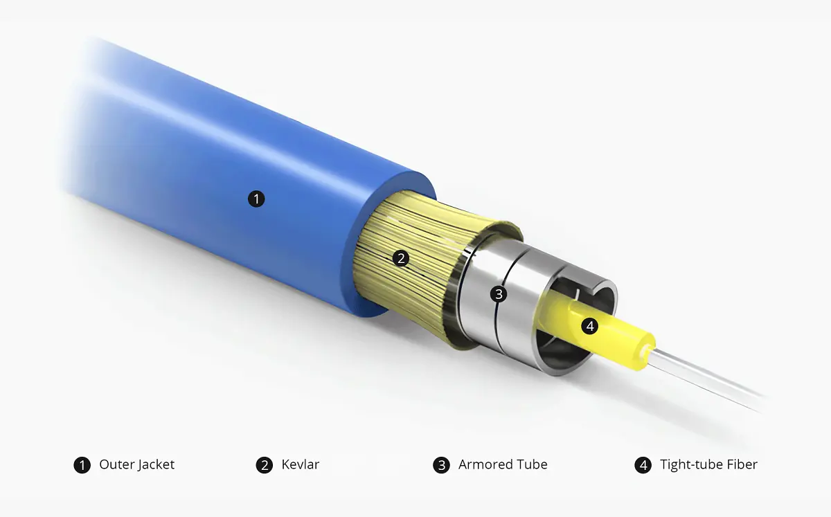 در بخش میانی کابل، لایه زره یا Armor قرار دارد. این قسمت معمولاً از فولاد ضدزنگ یا آلومینیوم ساخته میشود و نقش اصلی آن محافظت مکانیکی از فیبر در برابر فشار، ضربه، خمش و حمله جوندگان است. در نهایت، هسته مرکزی کابل شامل فیبرهای نوری است که با روکشهای ۹۰۰ میکرونی با طراحی Tight-Buffer پوشیده شدهاند. این نوع طراحی باعث میشود فیبرها بدون نیاز به ژل محافظ، ایمن و پایدار باقی بمانند و نصب کابل آسانتر انجام شود.